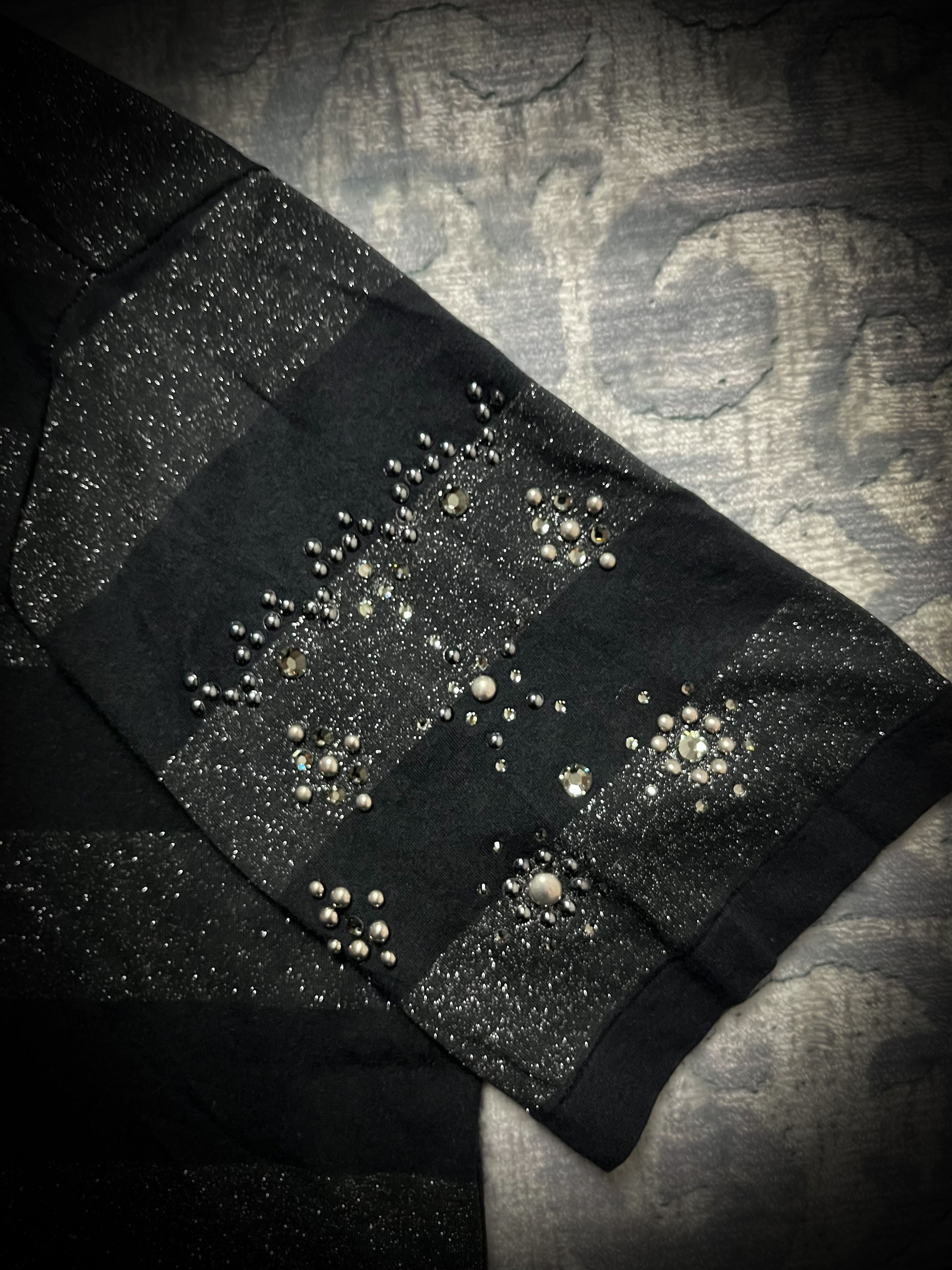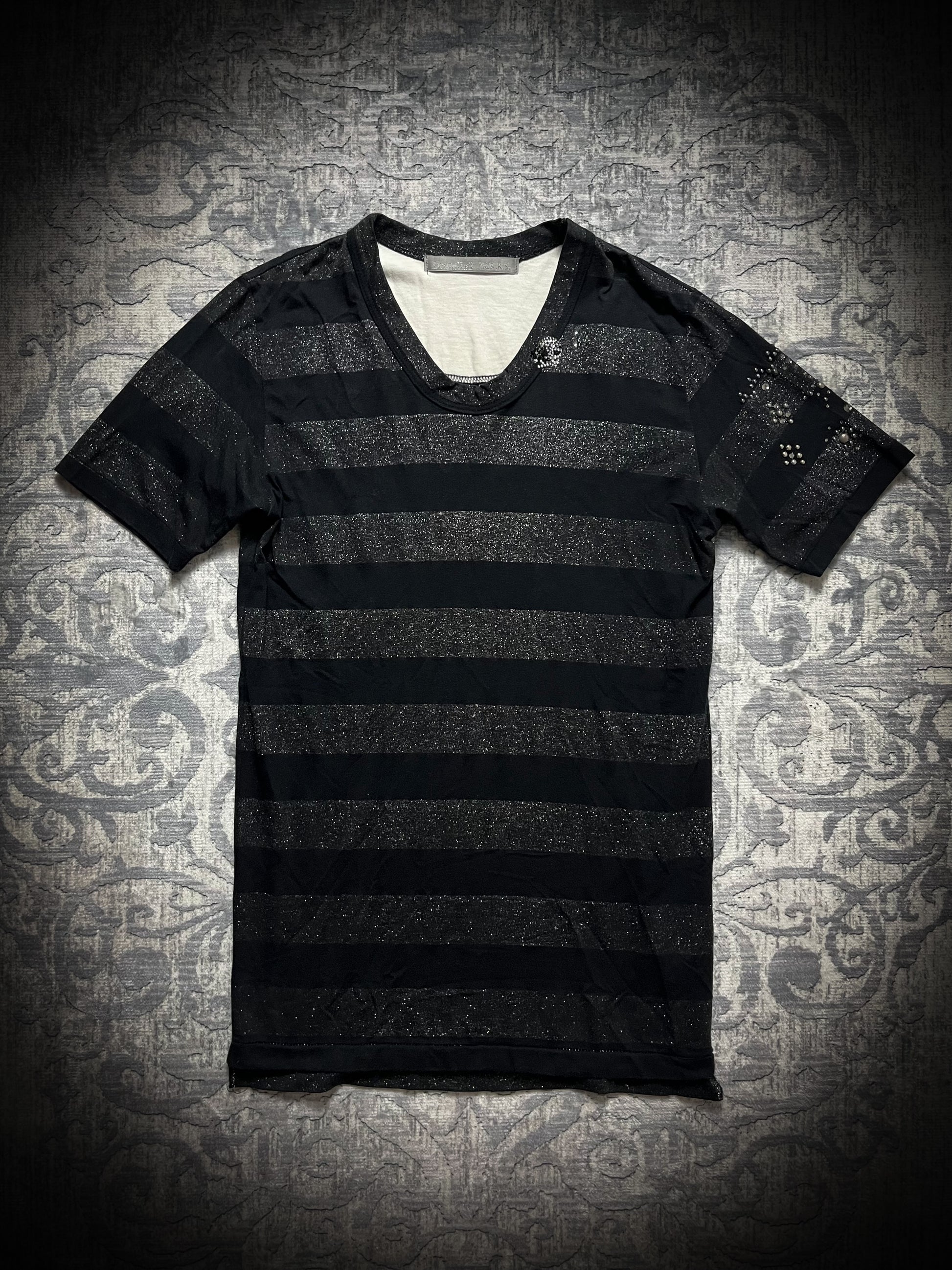 This black striped FranCisT MOR.K.S. T-shirt stands out with its subtle metallic shine and detailed accents. The shimmering stripes give it a unique look, while the small studs on the sleeve and neckline add a classy touch. Made from soft, lightweight fabric, it’s comfortable to wear and easy to combine with any outfit — perfect for both casual and dressed-up styles.