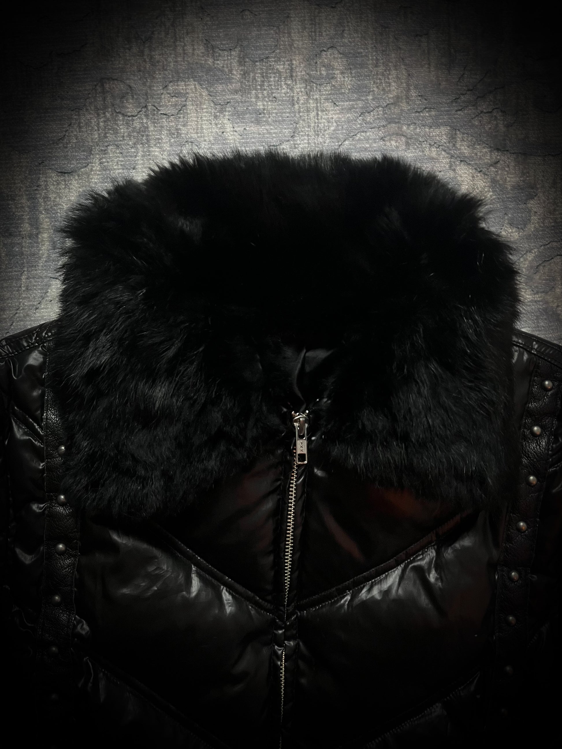 This black Jack Rose puffer jacket features a glossy, padded shell with a pronounced chevron-shaped quilt pattern on the front and diamond quilting along the shoulders and upper sleeves. The jacket is designed with a wide, dense black faux-fur collar and a central metal zipper closure. Vertical zip pockets are placed on both sides of the front. Leather-textured strap details with metal studs run along the shoulder line. The sleeves include long zip openings at the cuffs.