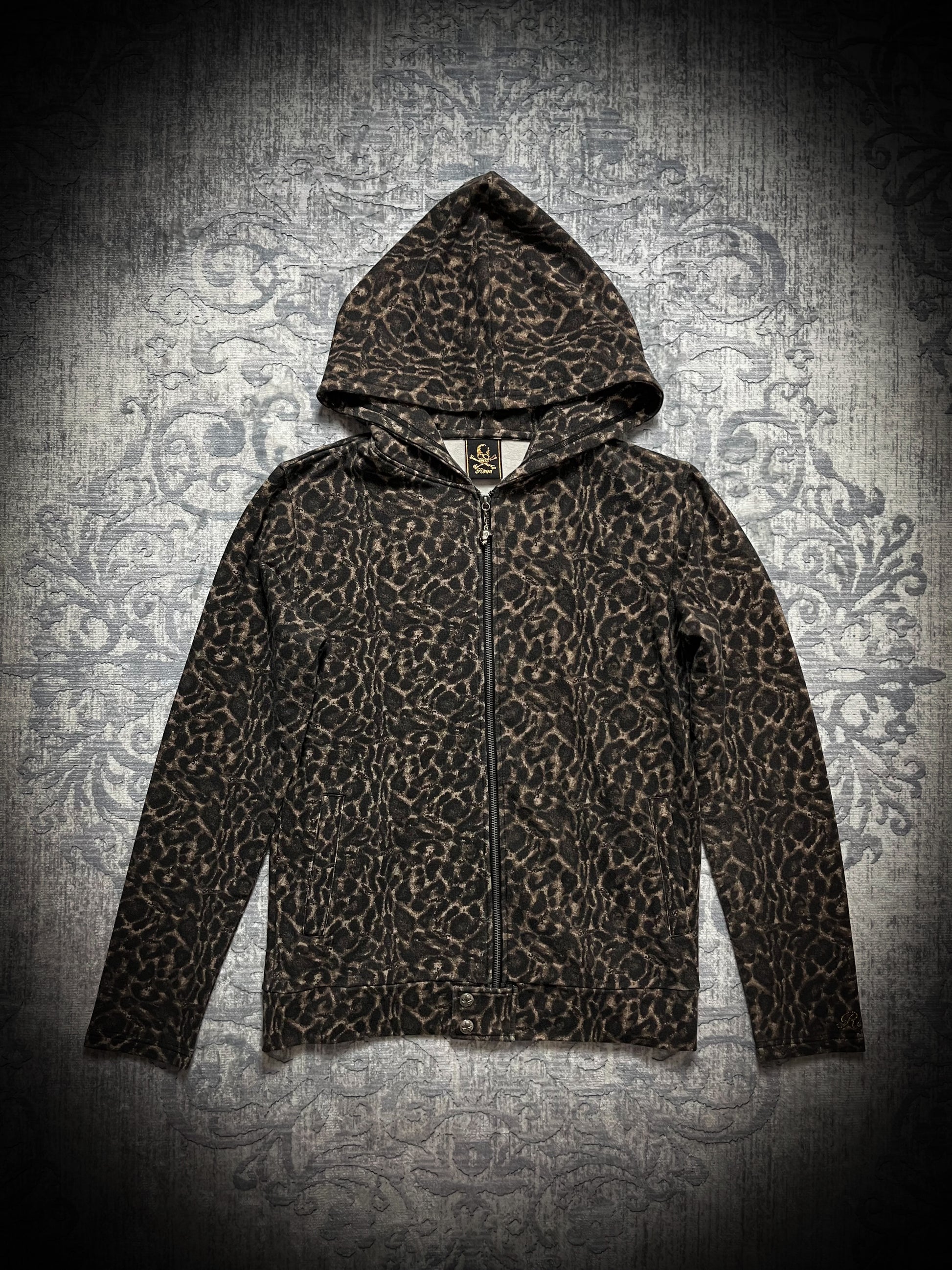 This zip-up hoodie features a subtle leopard-inspired pattern that gives it a cool and distinctive look. It also features a skull-shaped zipper pull that adds a unique detail. Made from soft, comfortable fabric.